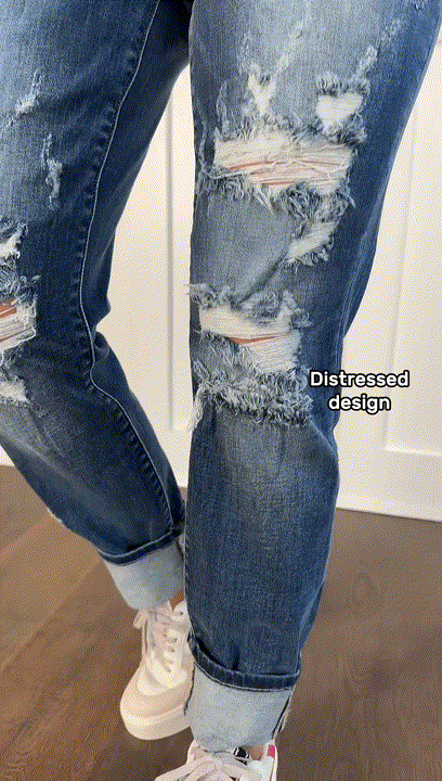 Boyfriend jeans never get old - they are ultra comfy and this pair is full of style with destroyed distressing and a cuffed hem.
